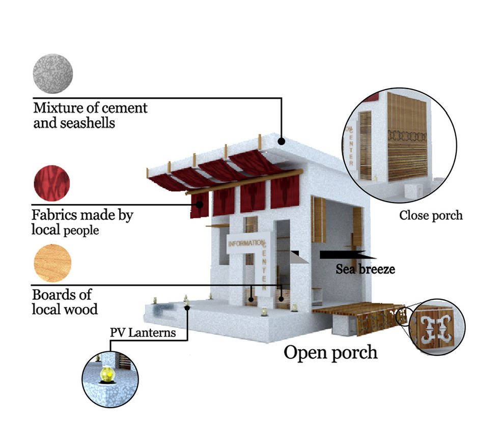 The design for the tourist booth is supposed to reflect the life and culture of Loft city. The booth was designed in a style to be noticeable for the tourists and have the architectural elements of the area. Based on the climate of Loft the booth is designed to provide a cool shaded shelter for the tourists to rest in. Booth is energy efficient and is made by local materials.